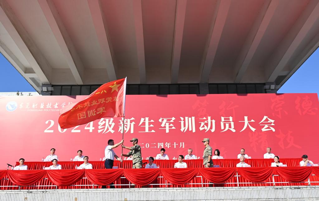 随后,杨云奇副校长向军训团授旗,军训团参谋长尹觉少校接旗。校党委书记司琪宣布开营,2024级新生军训正式拉开帷幕。