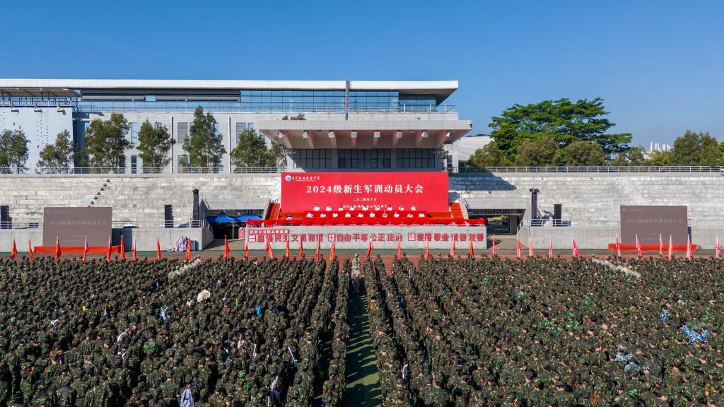 10月14日上午,我校2024级新生军训动员大会在学校体育场举行。校党委书记司琪,党委副书记、纪委书记蔡东宝,党委委员、副校长杨云奇,承训部队领导,我校相关部门负责人、负责新生军训的专职副书记、辅导员、班主任以及2024级全体新生参加大会。会议由保卫处处长刘高明主持。