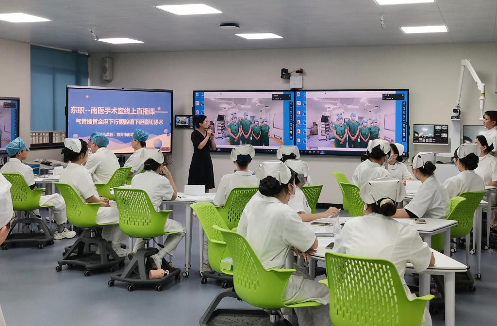 6月5日上午,卫生健康学院助产专业《外科护理》教学团队联合东莞市南城医院,面向23级护理1班学生成功开展手术室护理直播公开课。学校质量办及卫生健康学院部分教师现场观摩。